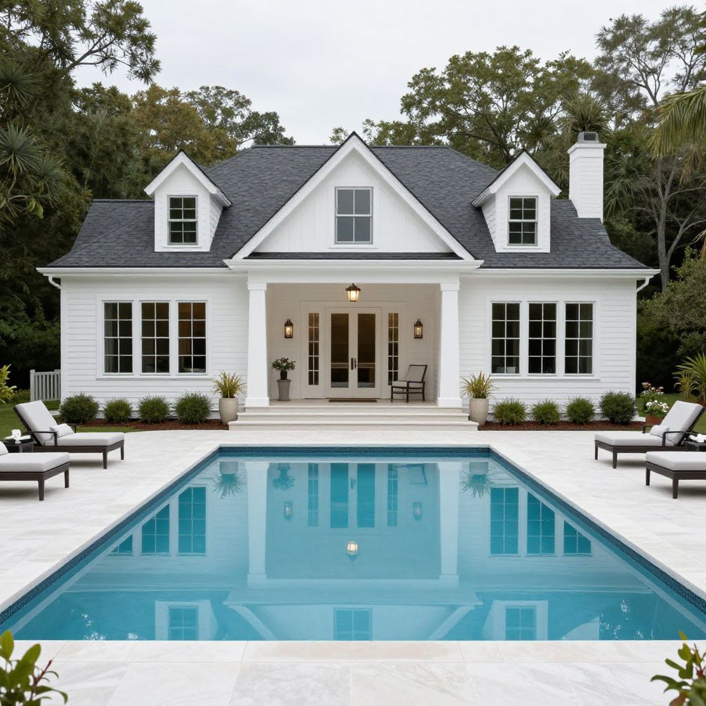 Photograph of a charming, white, two-story colonial-style house with a dark gray shingled roof. The house features multiple windows, a central front door with a glass pane, and two small gabled dormer windows. In front, a rectangular, clear blue swimming pool with a white deck is centered. Flanking the pool, on either side, are two white cushioned lounge chairs with dark wooden frames. The background includes lush green trees, adding a natural contrast to the bright white house and pool area. The image has a crisp, clean, and inviting aesthetic.