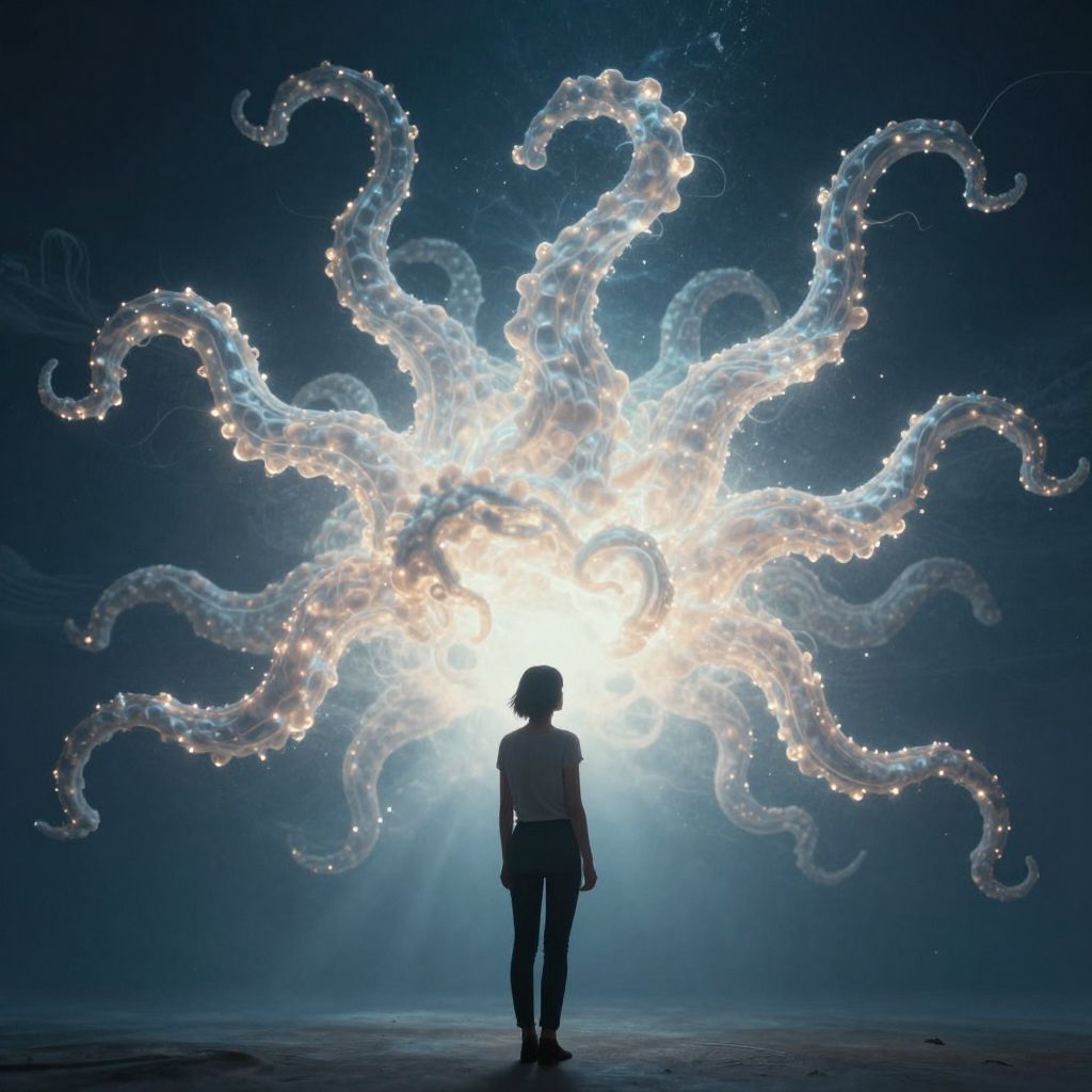A woman stands in contemplation beneath a radiant, amorphous cloud of glowing, tentacle-like forms that pulse with otherworldly light, defying gravity and reality.