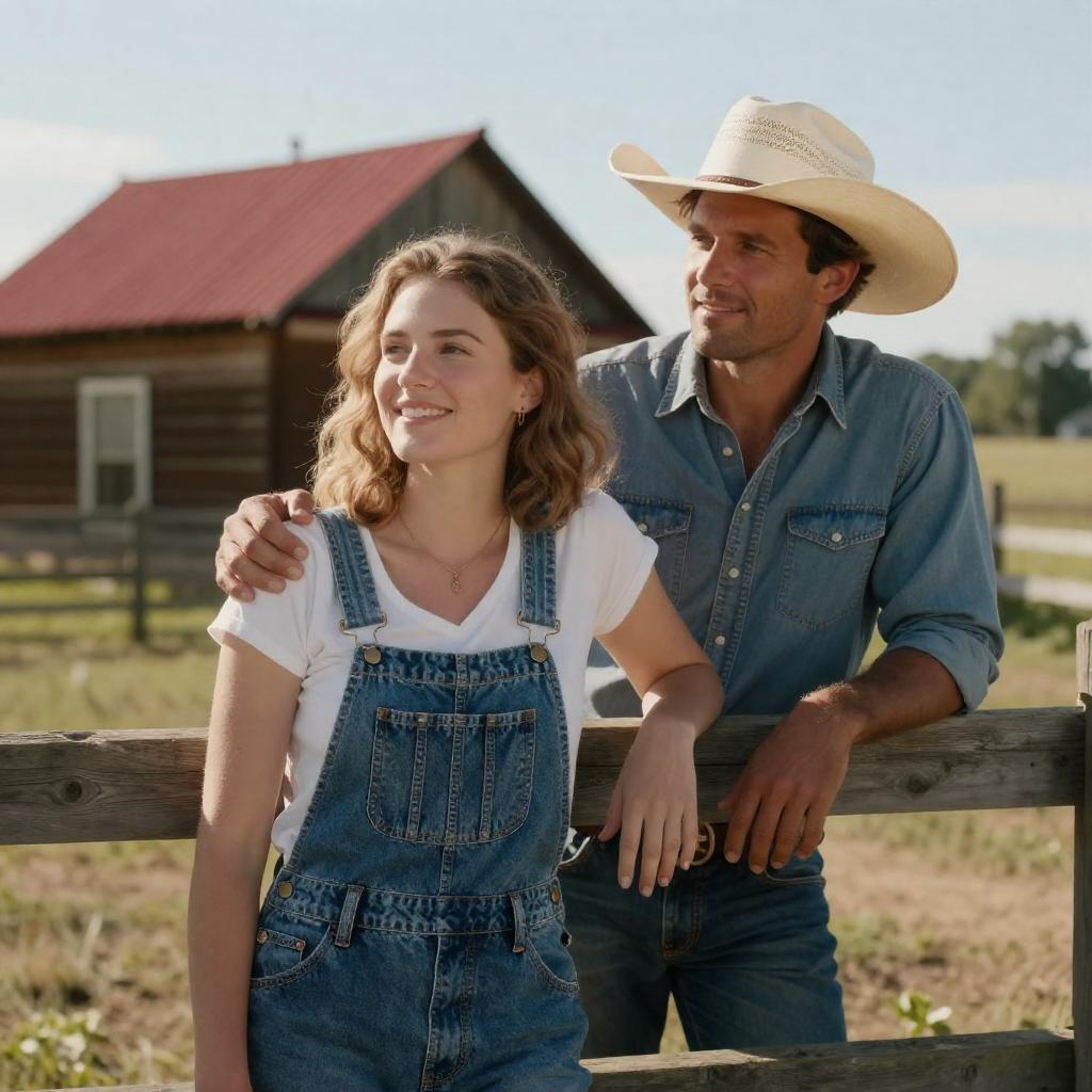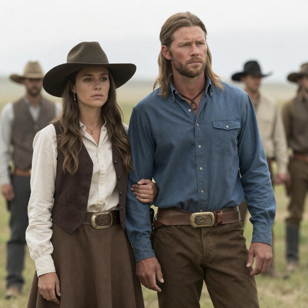 Photograph of a Western scene with a man in a brown cowboy hat and red shirt, facing a woman in a yellow fringe jacket and black scarf, standing beside a decorated horse. Two other people, one in a red shirt and another in a purple shirt, stand in the background. The setting includes wooden structures and greenery.