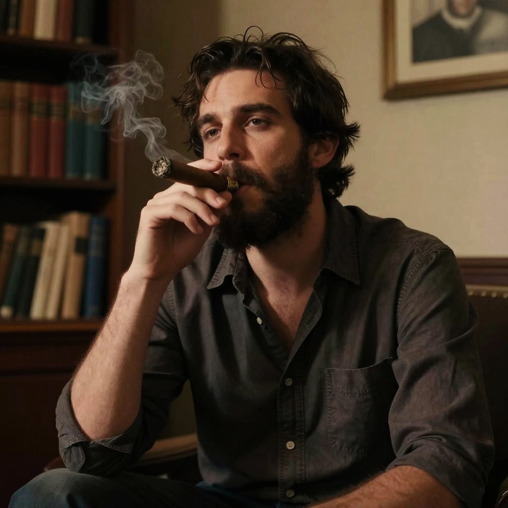 A photograph of a rugged, bearded man with dark, slightly messy hair, sitting in a dimly lit, vintage-style room. He's wearing a dark, button-up shirt with the top buttons undone, and he's holding a large, ornate cigar to his mouth with his right hand. The background includes a bookshelf filled with books and a framed picture on the wall. The lighting casts a warm, moody glow over the scene.