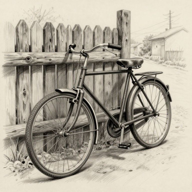 Art sketch of a vintage bicycle leaning against a rustic wooden fence, careful pencil shading highlights textures of metal and wood, subtle background elements hint at an old countryside road, warm nostalgic atmosphere portrayed through delicate line work.