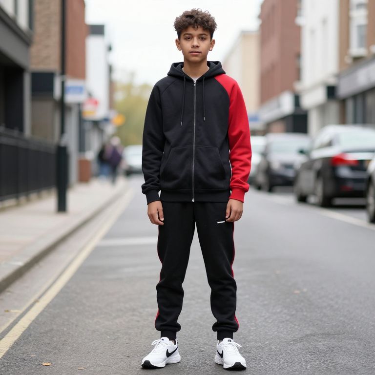 Scouser Tracksuit, boy in a hoodie and sweatpants standing in a street