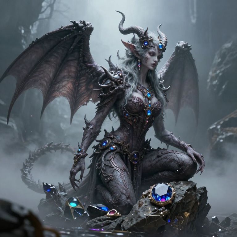 A mystical scorpion woman adorned with intricate, glowing armor and a large, serpentine horn, set against a dark, otherworldly background.