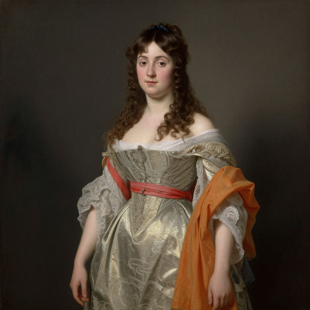 18th-century portrait of a young woman with long curly brown hair, fair skin, wearing an ornate silver dress with white lace, red sash