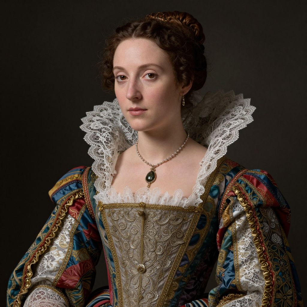 A classical portrait of an elegantly dressed woman in Renaissance-inspired attire, featuring intricate lace detailing and a richly colored gown, rendered in a high-definition digital art style with dramatic lighting that highlights her serene expression and refined features.
