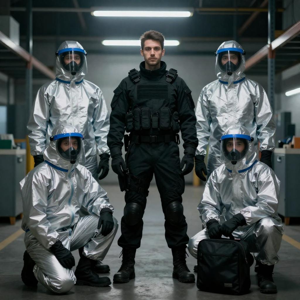 Photograph of four men in a dimly lit industrial setting. Three men wear shiny silver hazmat suits with face shields, kneeling and standing, while one man in a black tactical suit stands in the center. The background includes metal shelves and fluorescent lights. The men in hazmat suits have gloved hands, and the central figure holds a black bag.
