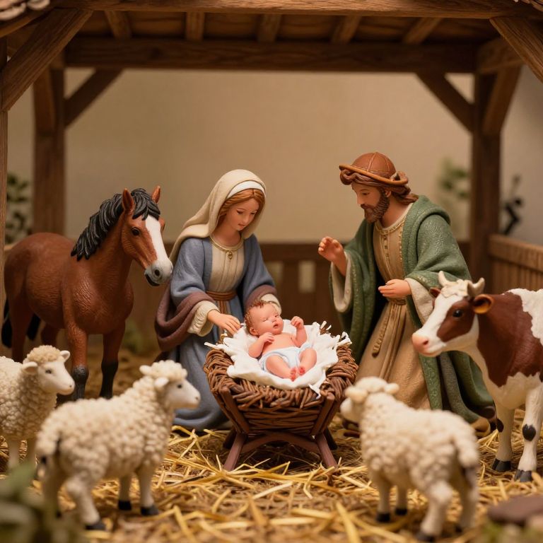 Colorful digital illustration of the Nativity scene with a smiling baby Jesus in a manger, surrounded by Mary, Joseph, shepherds, and