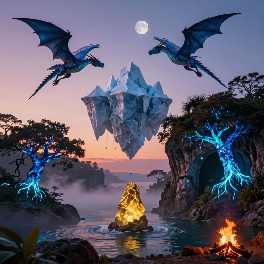 A mesmerizing sunrise, islands floating in air, iceberg, flying dragons, cave, trees with fluorescent roots, cave entrance glowing with light from the inside, a single golden rock formation, water droplets, lit by natural light, scintillating bonfires, natural glow, moonlight, fluorescence, sunlighteverything looks perfect, good vibes, positivity, most beautiful picture in the world, <8k, high detail, uhd, sharp focus, palette, photorealistic, absurdres, extreme detail, as much detail as possible, extremely high visibility>, muted maroon, bright azure, matte yellow, bright indigo