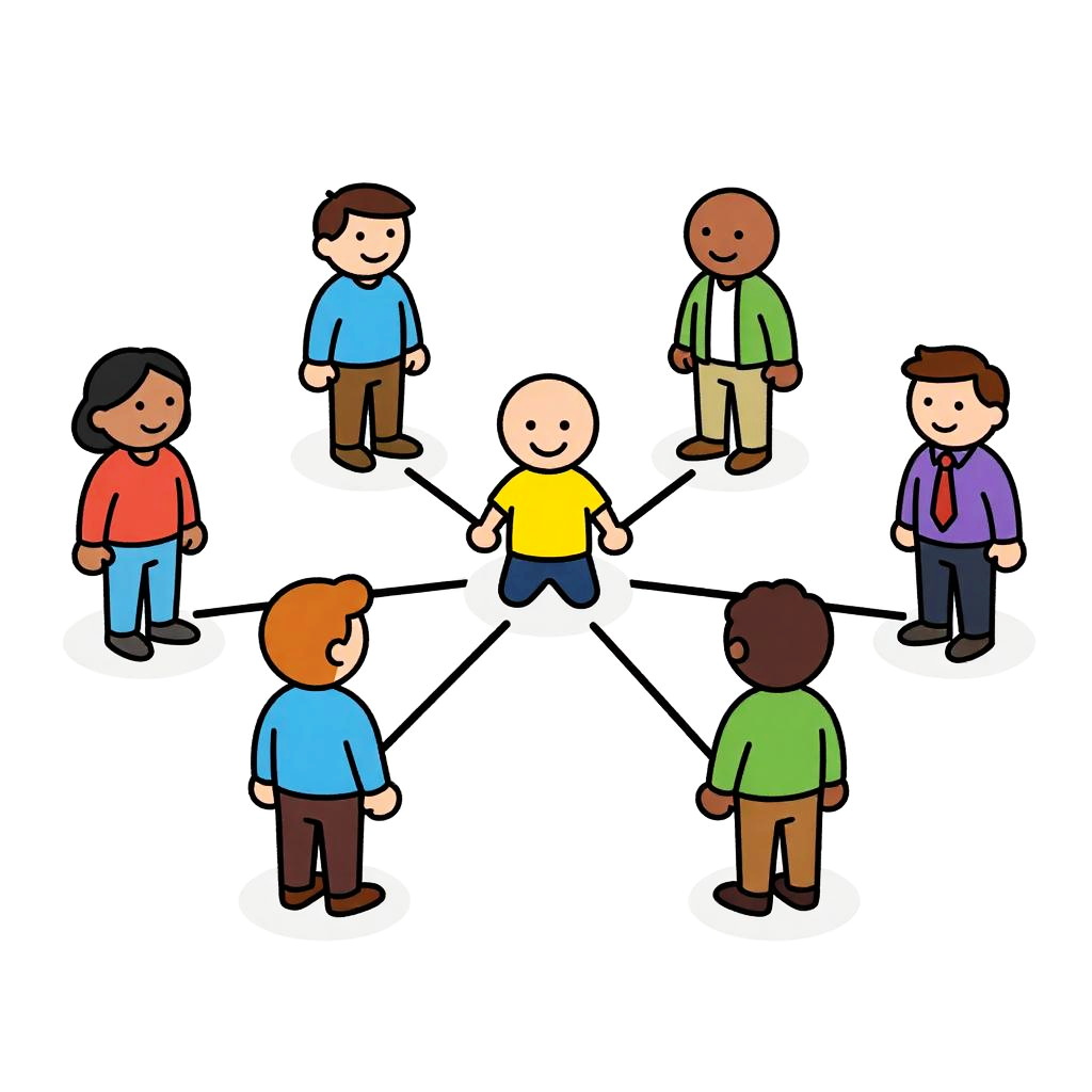 Diffusion of innovation cartoon illustrating early adopters influencing others, network lines connecting smiling figures, bright palette, dynamic and informal drawing style