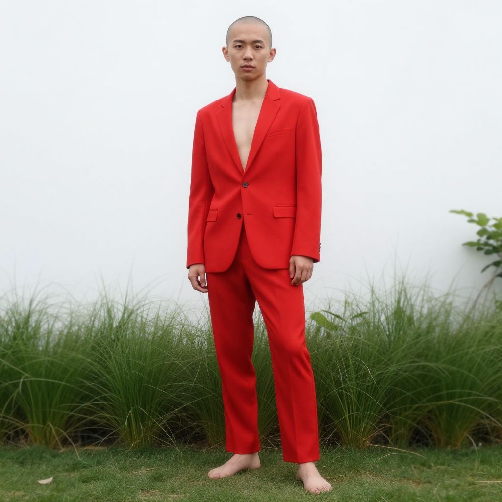 "pink blazer costume, solo, 1boy, male focus, jacket, pants, standing, full body, realistic, black hair, red footwear, parody, sunglasses, suit Realistic photo of casual sexy person with pretty face"
