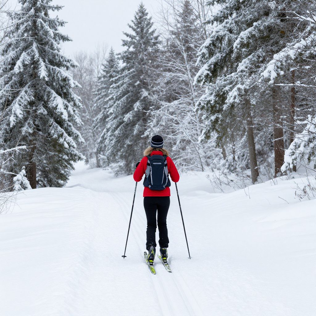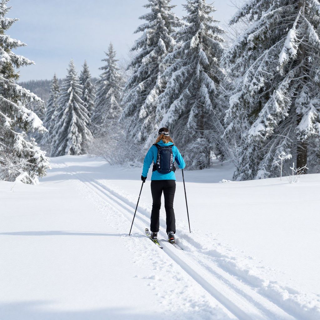 A woman cross-country skis in fresh white powdery snow with a snow covered treeline in the background.
