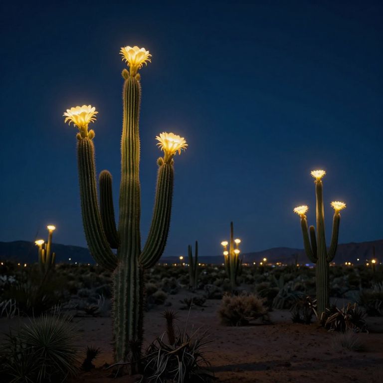 Photograph of a dark desert night with illuminated, glowing cactus tops against a deep blue sky, scattered streetlights visible in the background.