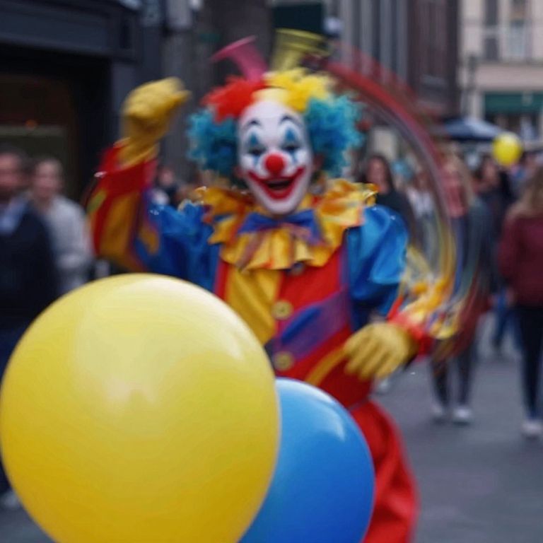 Colorful clown with white face paint, red nose, and multicolored wig waves at a street festival, holding a large yellow balloon.