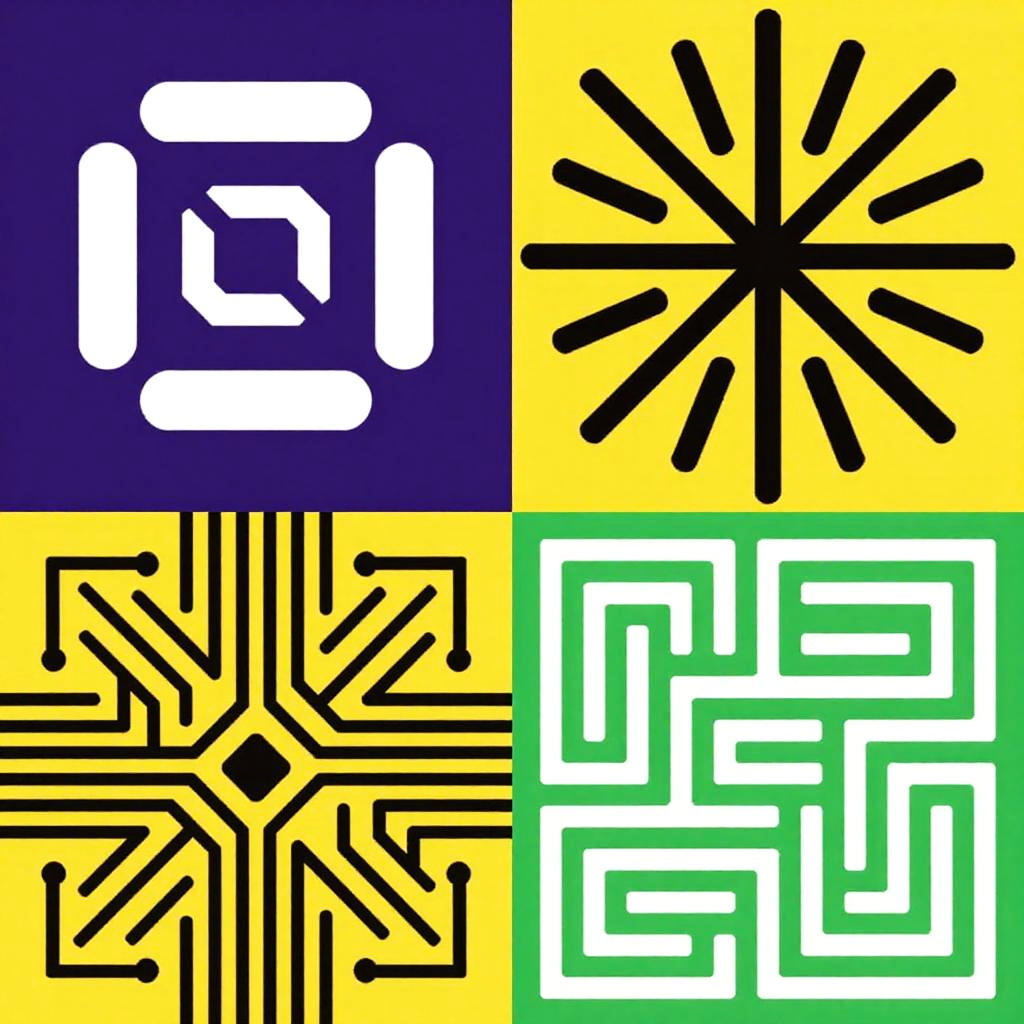 This image is a digital collage featuring four distinct, colorful, and textured square patterns. The top-left square is dark purple with a white geometric symbol, the top-right is yellow with a black, symmetrical, sun-like design, the bottom-left is yellow with black, intricate, circuit-like lines, and the bottom-right is green with a white, repetitive, maze-like pattern. Each square has a unique, abstract style.