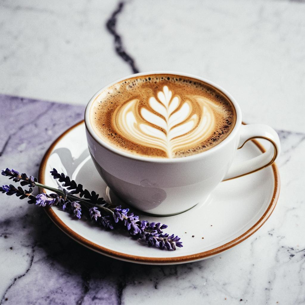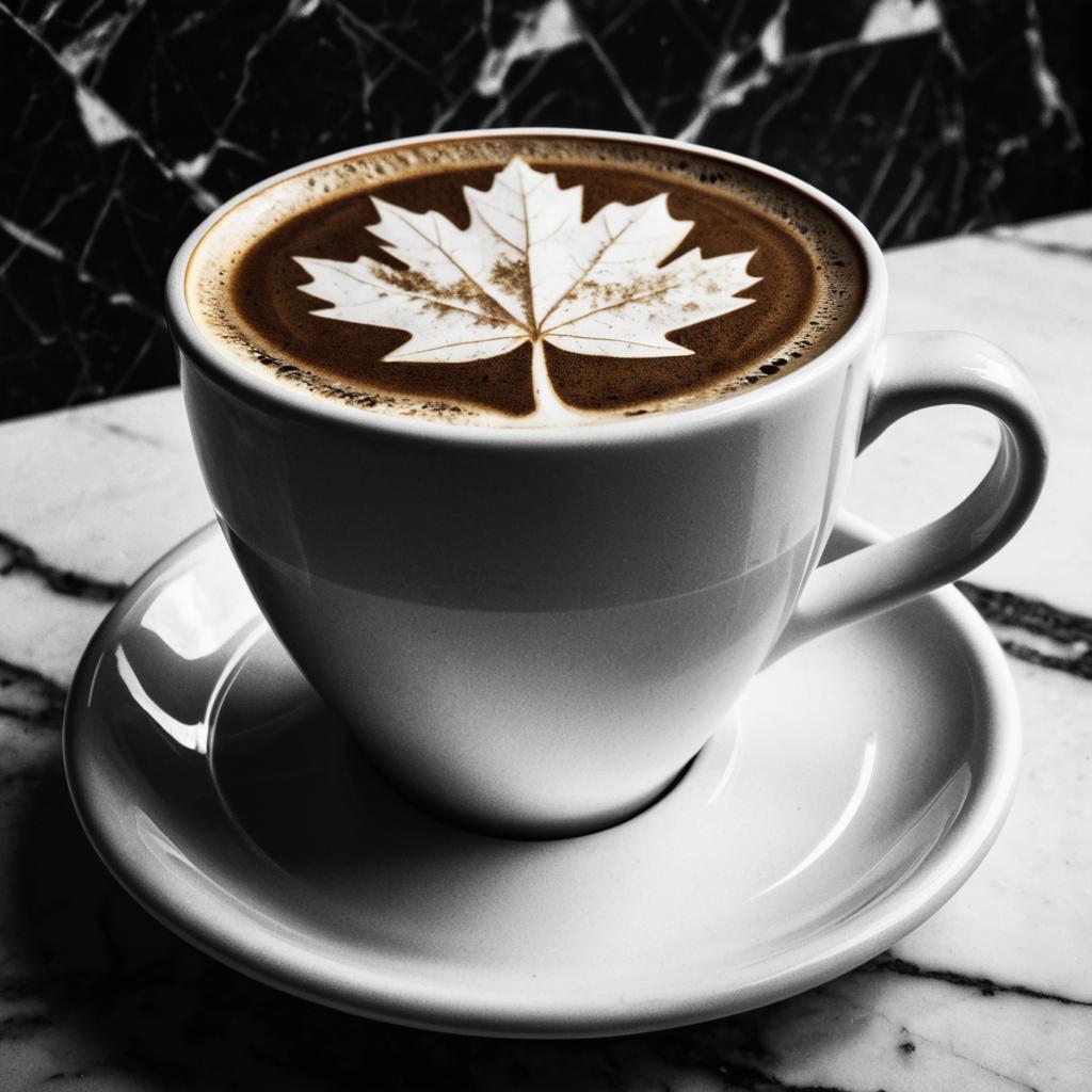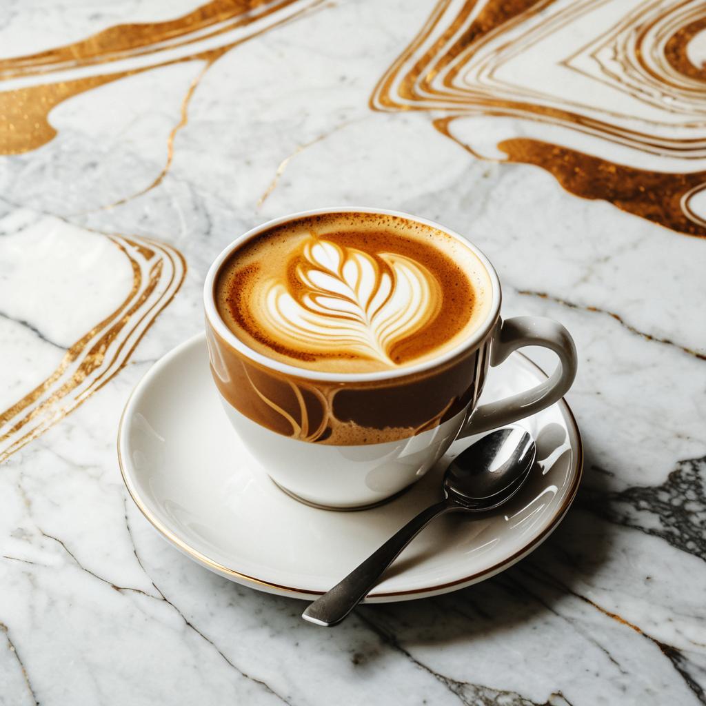Latte coffee cup with butterscotch, in the style of Impressionism, intricately textured, nostalgic atmosphere, UHD image, marble background