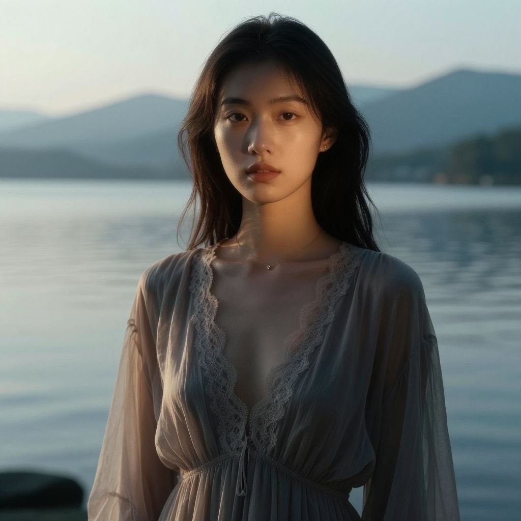 Photograph of an Asian woman with long, dark hair standing by a serene lake at sunset. She has a fair complexion and a slender build, wearing a sheer, gray, lace-trimmed dress with a deep V-neck, revealing her collarbones. Her expression is neutral, and she gazes directly at the camera. The background features calm water with gentle ripples, and distant, softly lit mountains under a clear sky. The light creates a subtle glow on her face and dress, enhancing the tranquil atmosphere. The image captures a peaceful, natural setting with a focus on the woman's delicate appearance.