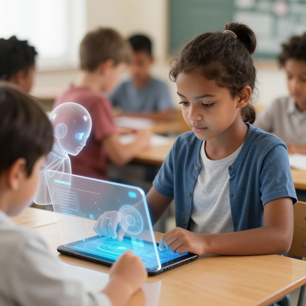 Child AI photo prompt: A diverse child in a classroom setting interacting with a transparent AI assistant on a smart tablet, digital interface blending with real-world elements, warm classroom lighting, naturalistic composition, detailed facial expression, Dall-E 3 style.