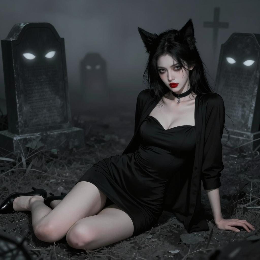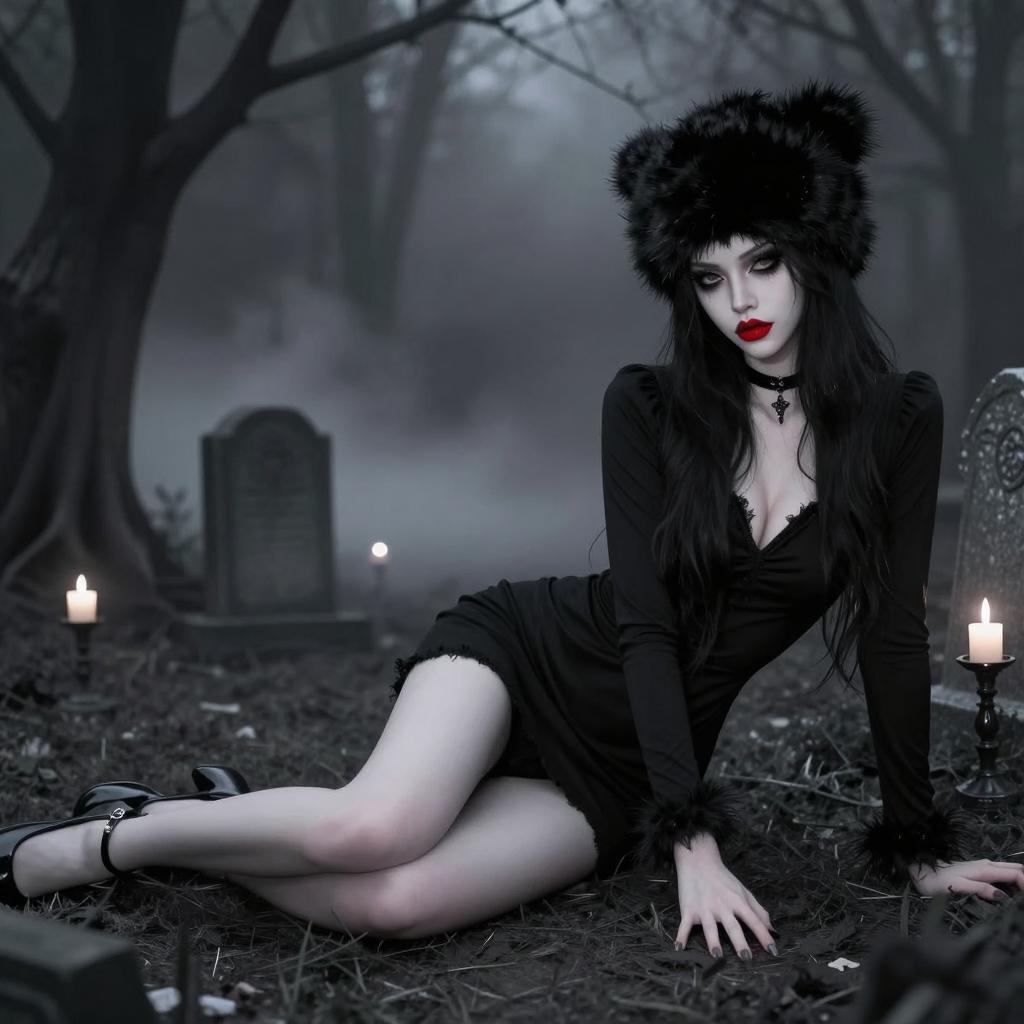 Woman with pale skin and black fur hat, wearing a deep V-neck black outfit and black heels, lying on ground. Her legs are stretched out, one arm extended forward, and the other supporting her body. Background includes fog, dark trees, tombstones, and glowing lights. Intense red lipstick, heavy eyeliner. Digital illustration with gothic style.