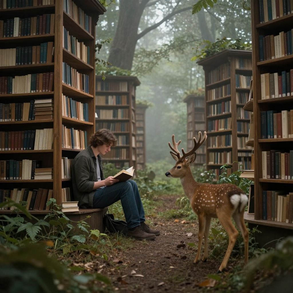 In a dimly lit library where shelves stretch endlessly into the horizon, a man adorned with majestic antlers holds an open book, illuminated by ethereal lights that dance along the aisles, creating a surreal blend of knowledge and otherworldly wonder.