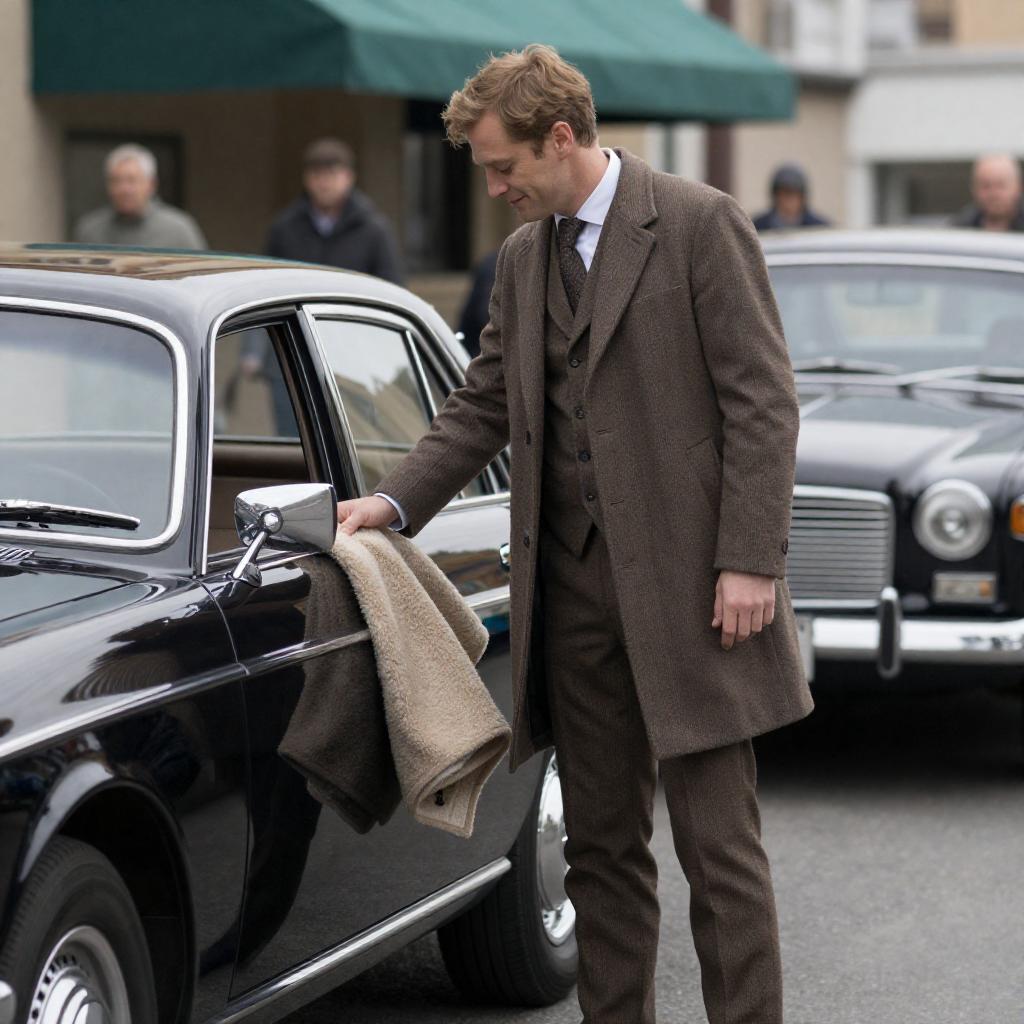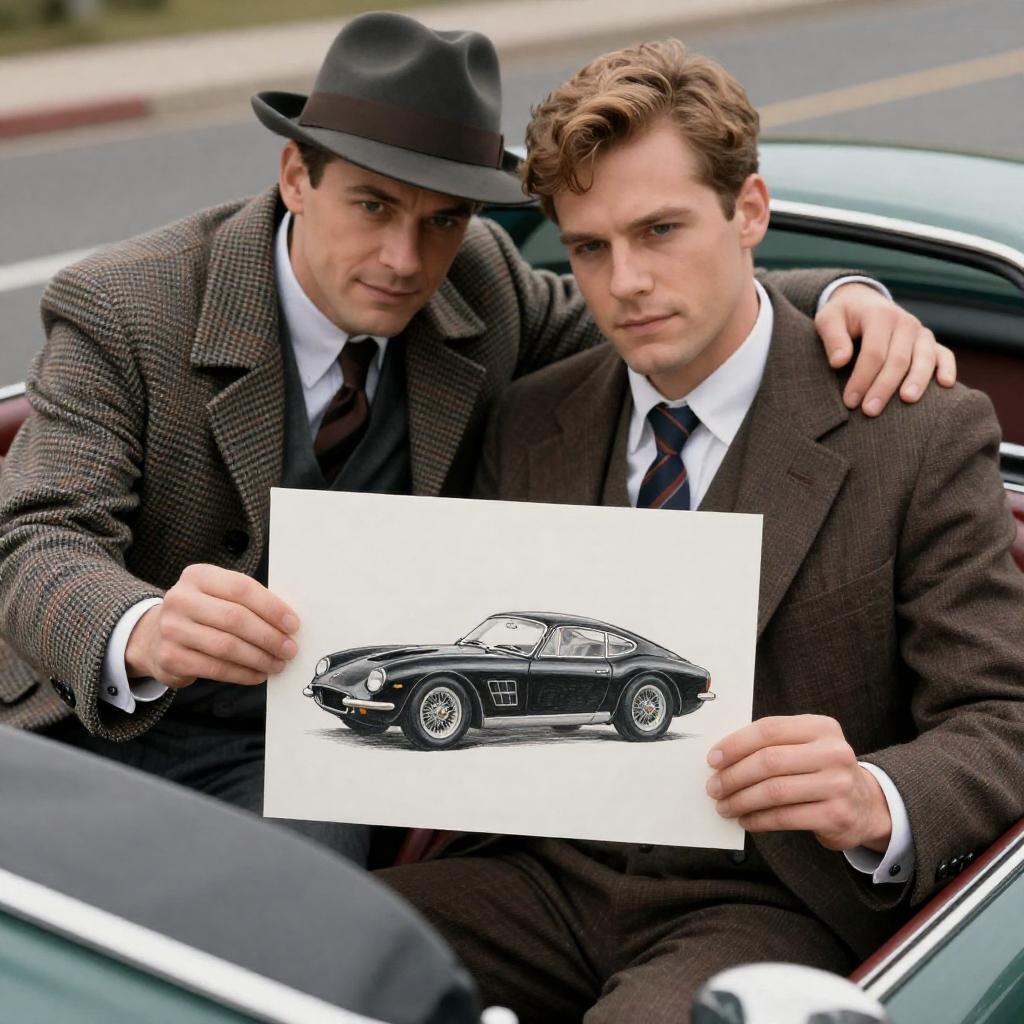 Photograph of two men in a vintage car. The man on the left, wearing a plaid coat and hat, leans forward, arm around the other man. The man on the right, in a brown suit and striped tie, holds a drawing of a sleek, black sports car. Both men have focused expressions. The car's interior is visible, with a retro design. The drawing is held up prominently in front of them.