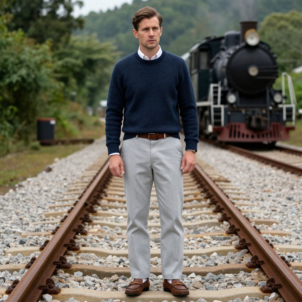 A man, navy merino wool sweater, light gray khakis, brown leather loafers, white button-up shirt, matching brown leather belt, vintage locomotives, rusted tracks, lush green surroundings, cri film style, contemplative expression.Man has masculine face and piercing eyes