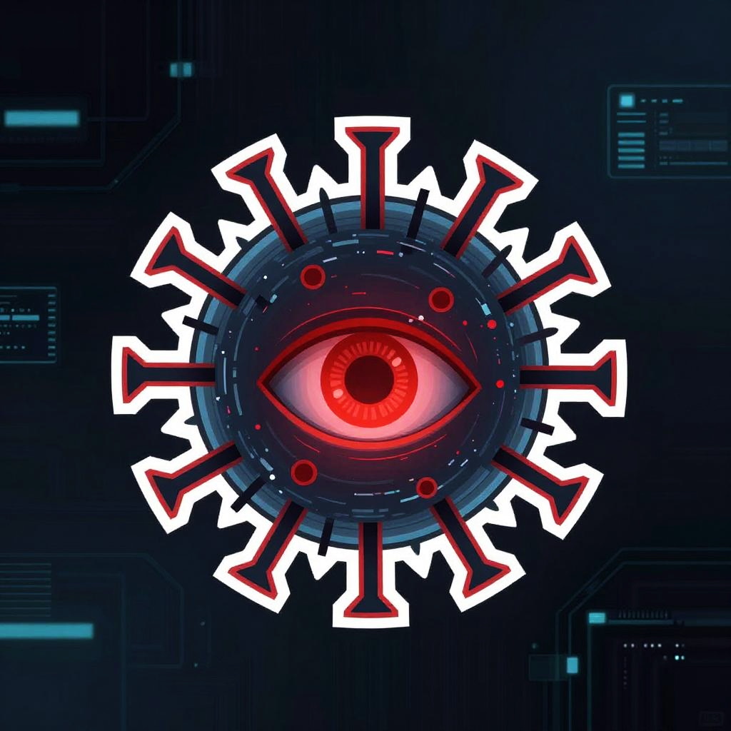 Computer virus logo combining glitch art aesthetics with sharp angular shapes and a glowing red eye, set against a dark cybernetic backdrop