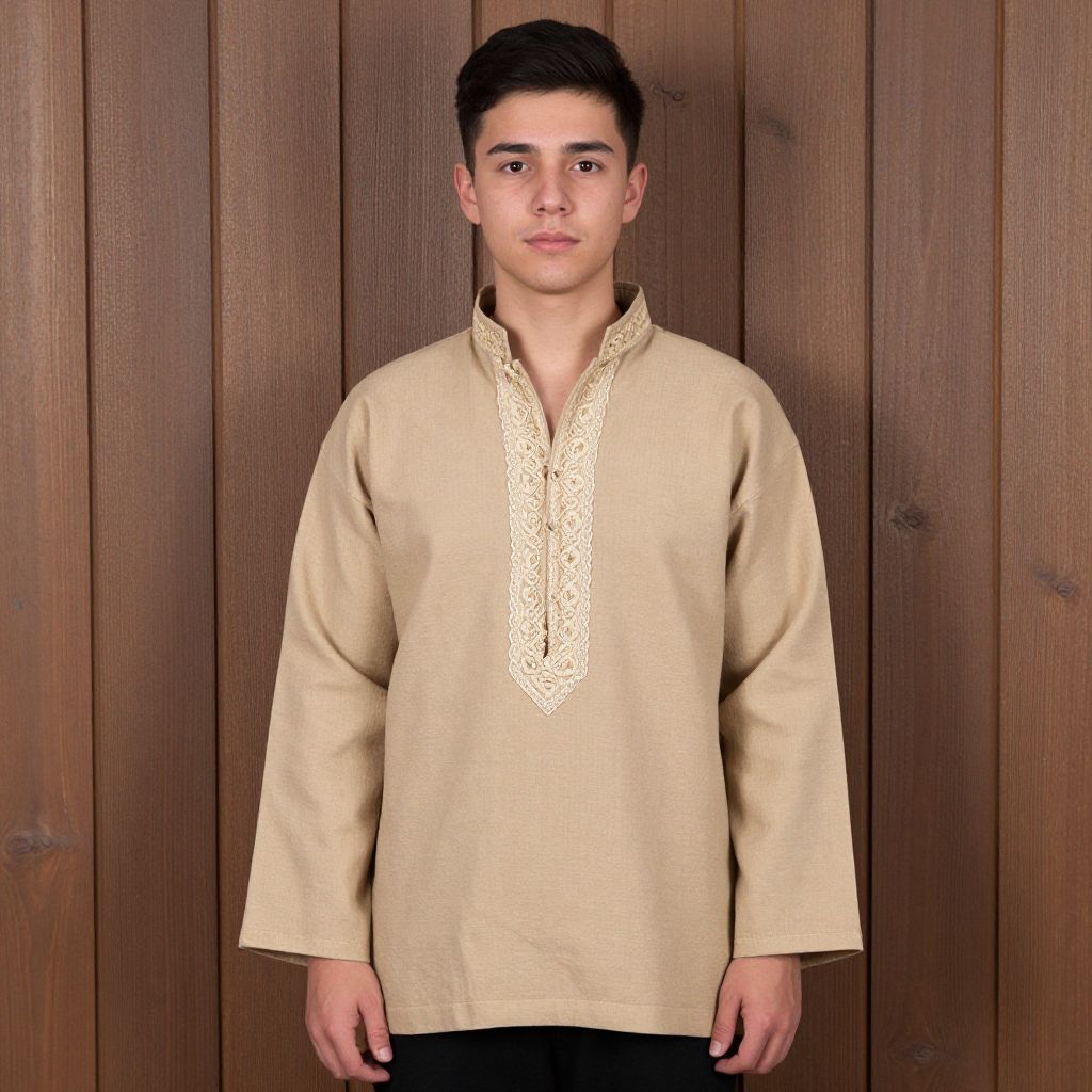 A young man standing against a wooden wall wearing a traditional chore jacket made in a sustainable tan brushed cotton canvas