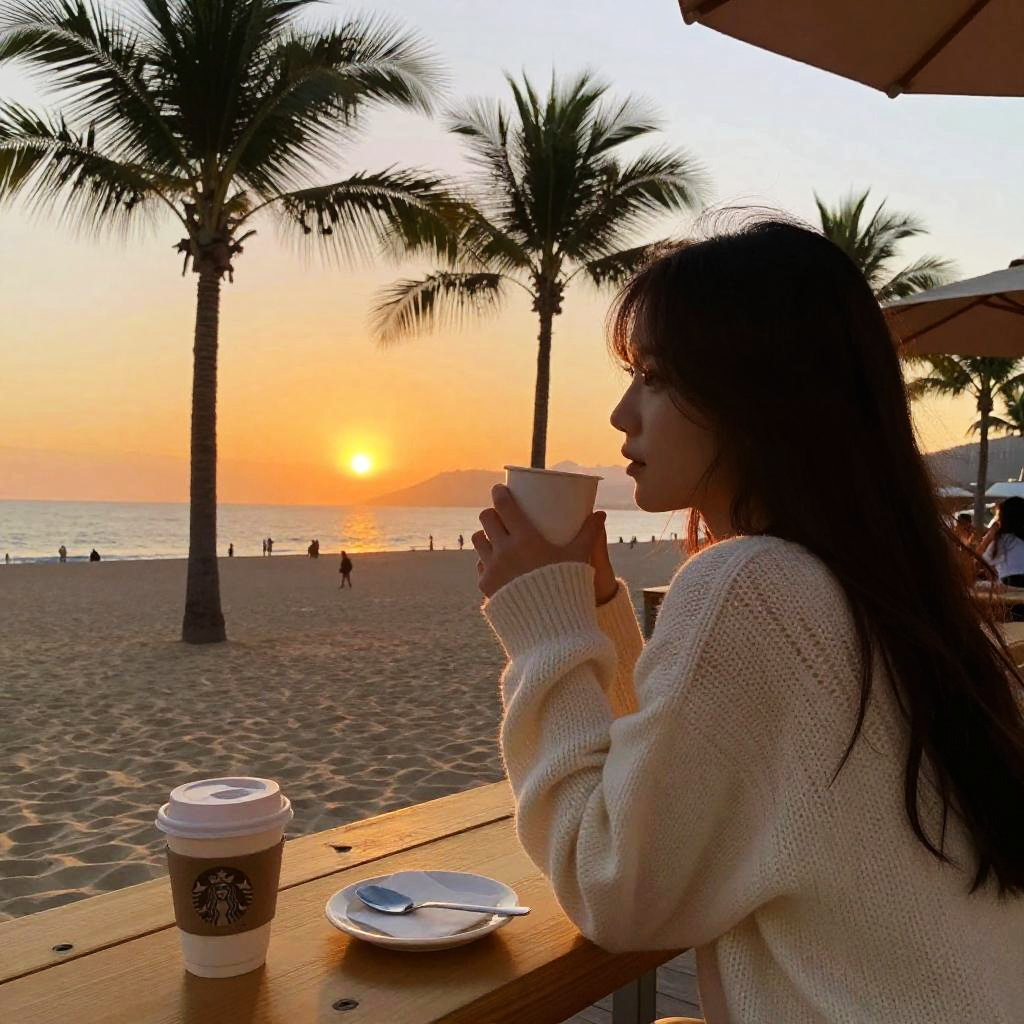 Photograph of a woman with long dark hair and bangs, wearing a white knit sweater, sitting at a beachside wooden table during sunset. She holds a white coffee cup with both hands, looking to the right. A disposable coffee cup with a lid and a white saucer with a spoon are on the table. Palm trees are in the background, silhouetted against a vibrant orange and pink sunset sky. The sun is low on the horizon, casting a warm glow over the sandy beach and ocean waves. People are faintly visible in the distant background, enjoying the beach.