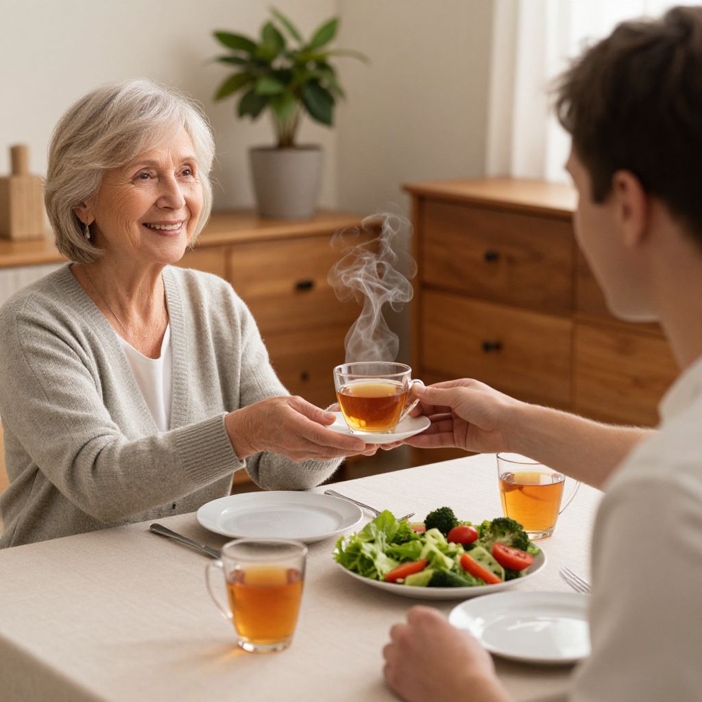 Caring adult assists an elderly woman by handing her a steaming cup of tea during a cozy indoor gathering, surrounded by warm wooden furniture, fresh greenery, and a table set with a salad and beverages.