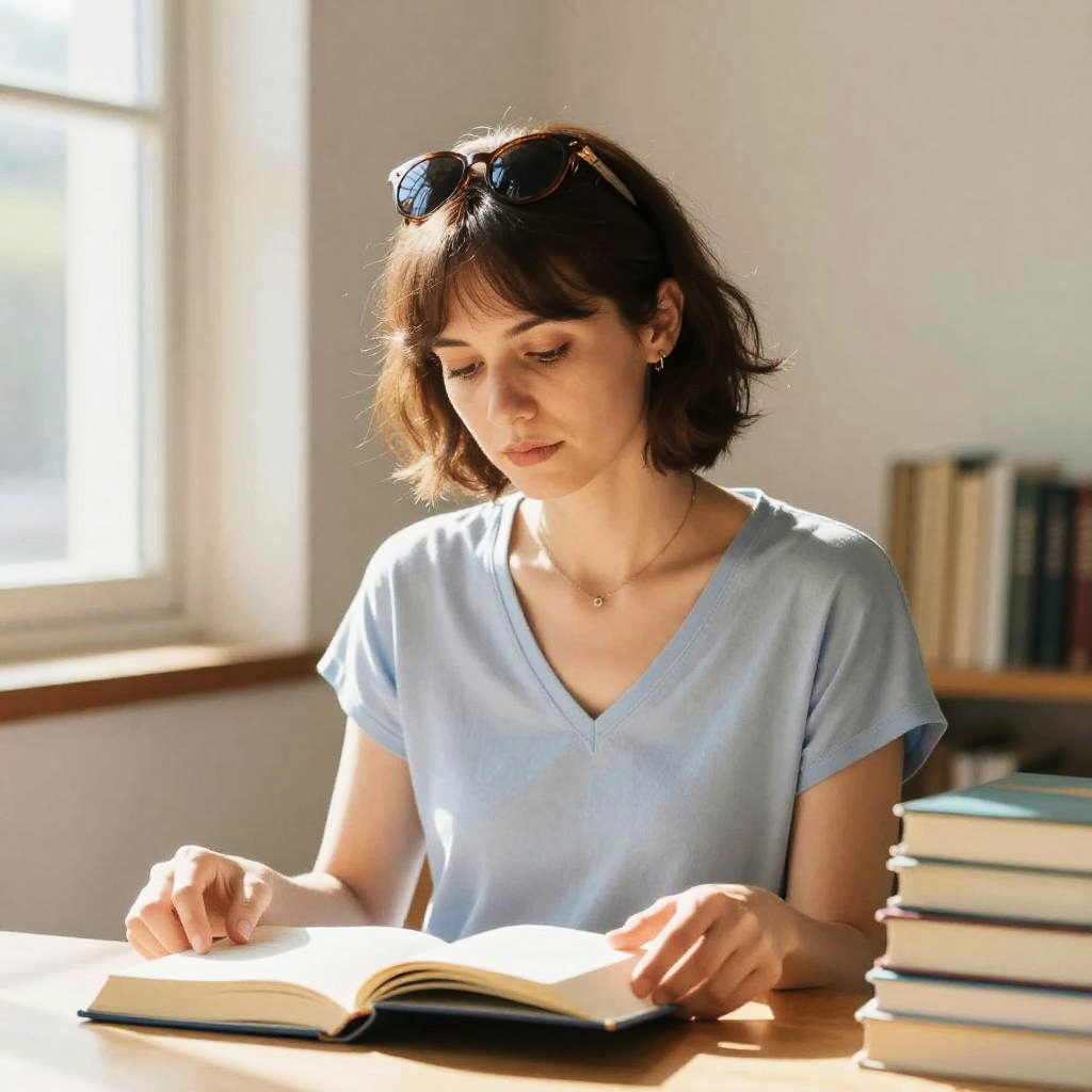 A photograph of a curly-haired woman with fair skin, wearing a white sleeveless top, intently reading a book under a bright desk lamp. She's seated, leaning forward with her chin resting on her hands. The background is a plain, slightly blurry gray wall. The image has a slightly grainy, high-contrast feel, emphasizing the light and shadows on her face and book.