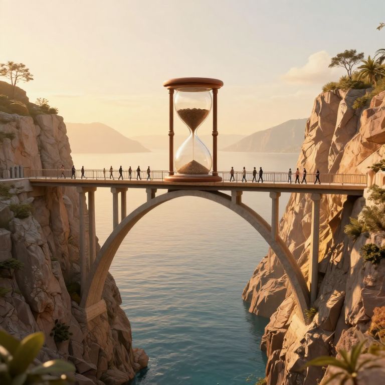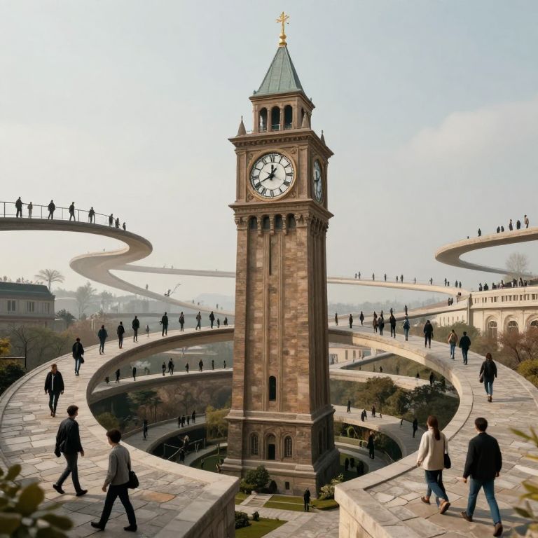 Surreal clock tower stands tall amidst swirling stone pathways, where countless figures traverse in endless loops, defying gravity and time as they navigate the paradoxical motion of infinite, backward-and-forward spinning hands.