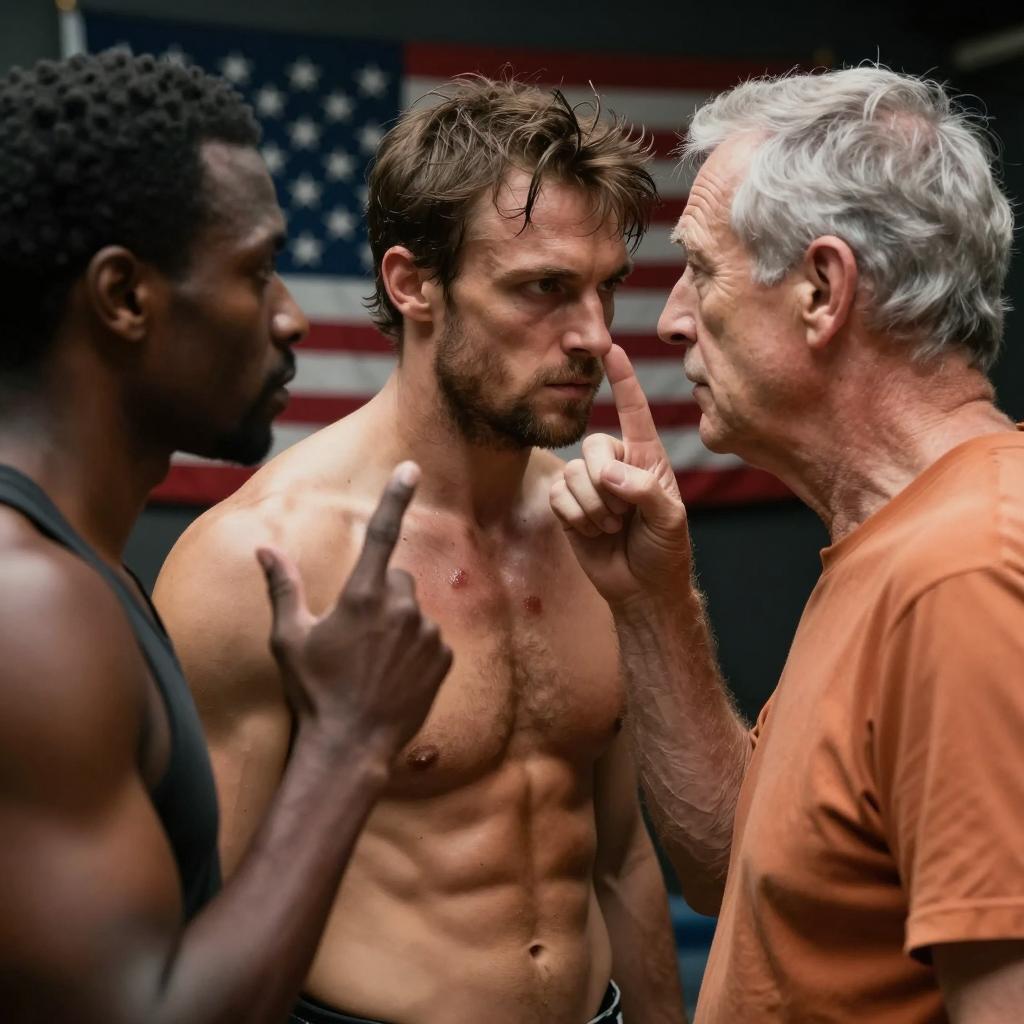 Photograph of three men in a dimly lit room. Center: shirtless, muscular man with messy brown hair, intense expression, face close to older man. Older man, gray hair, orange shirt, nose touches center man's nose. Left: African-American man, dark hair, gesturing with index finger. American flag in background. Center man's chest has minor bruises. Center and right men have close, intense eye contact.