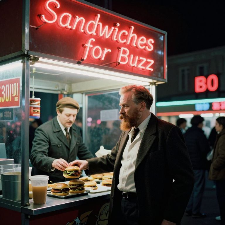 Analog-style photo of a man buying a burger at a retro fast-food stall with a red neon sign reading 'Sandwiches for Buzz' at night. The scene captures a 1960s ambiance with vintage fashion, featuring a detailed street setting and warm lighting that highlights the analog film aesthetic.