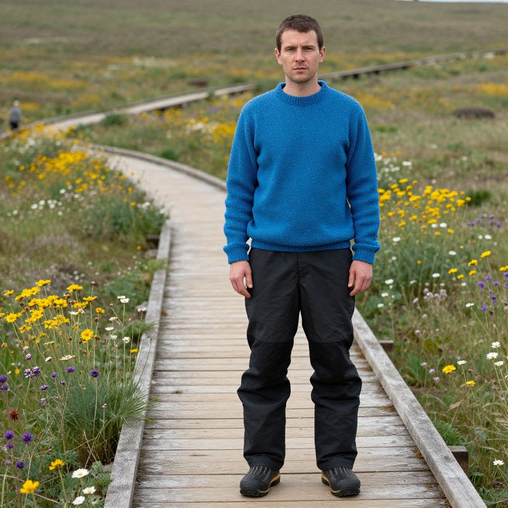 A man, electric blue insulated pullover, black softshell ski pants, thermal leggings, waterproof winter boots, wind-resistant material, rustic wooden boardwalks winding through vibrant wildflowers blooming, 3M ferrania analog film stock, contemplative expression Man has masculine face and piercing eyes