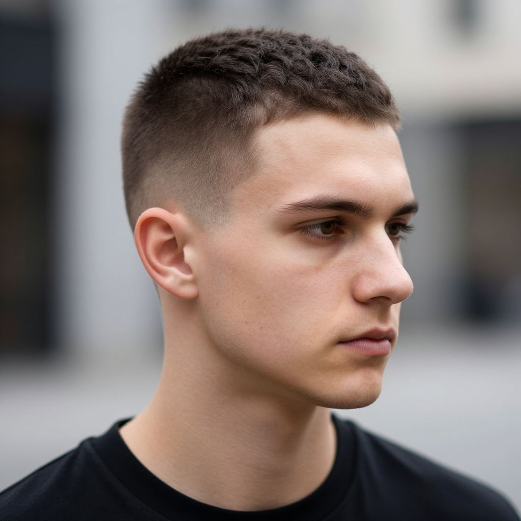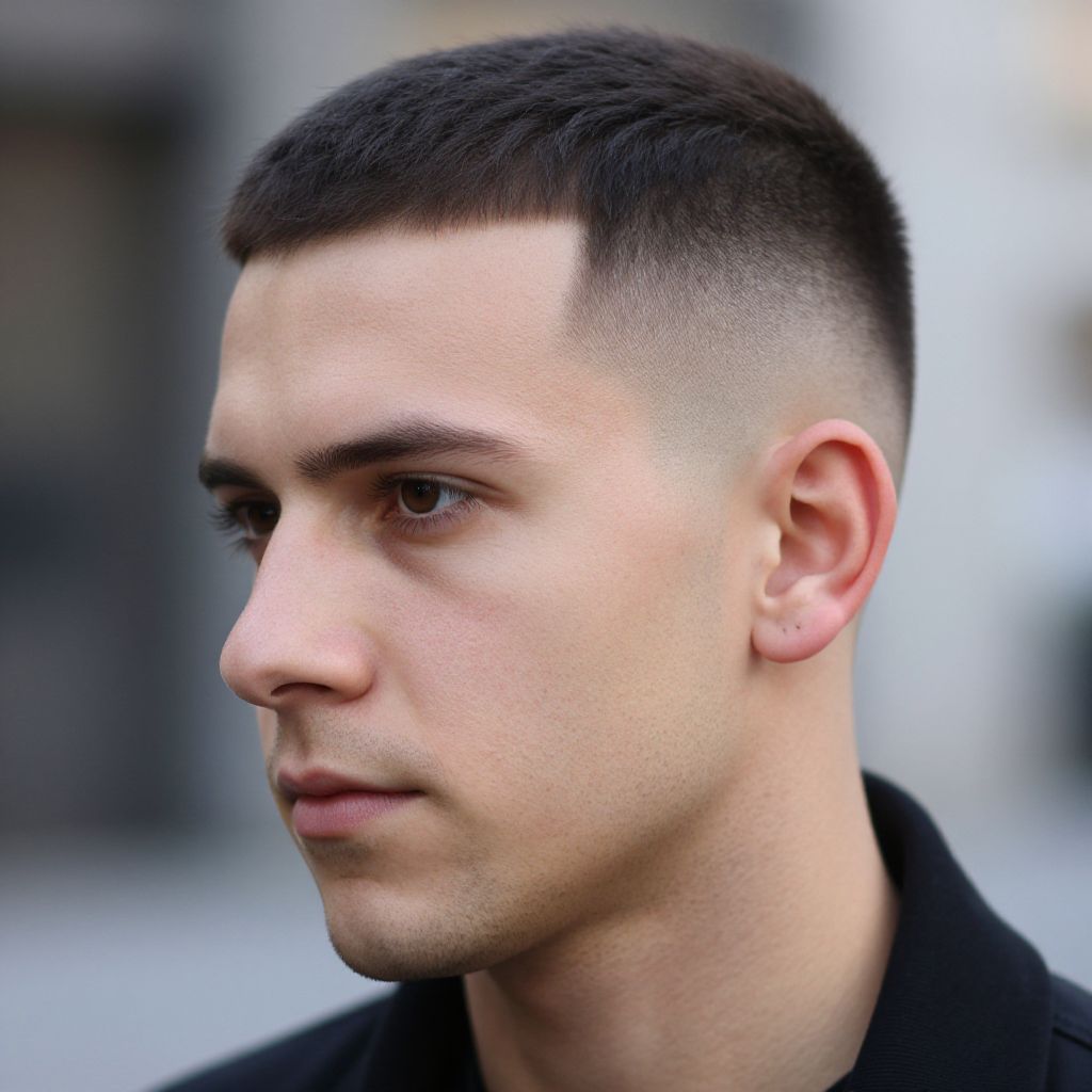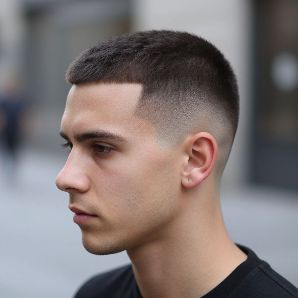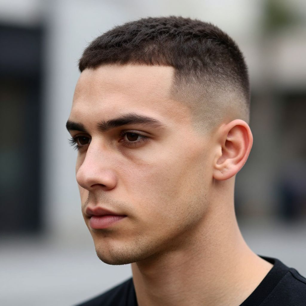 Flat Top Crew Cut, fit European man, realistic photography, natural light, urban street style, clean lines, modern look, textured hair, professional portrait, high detail