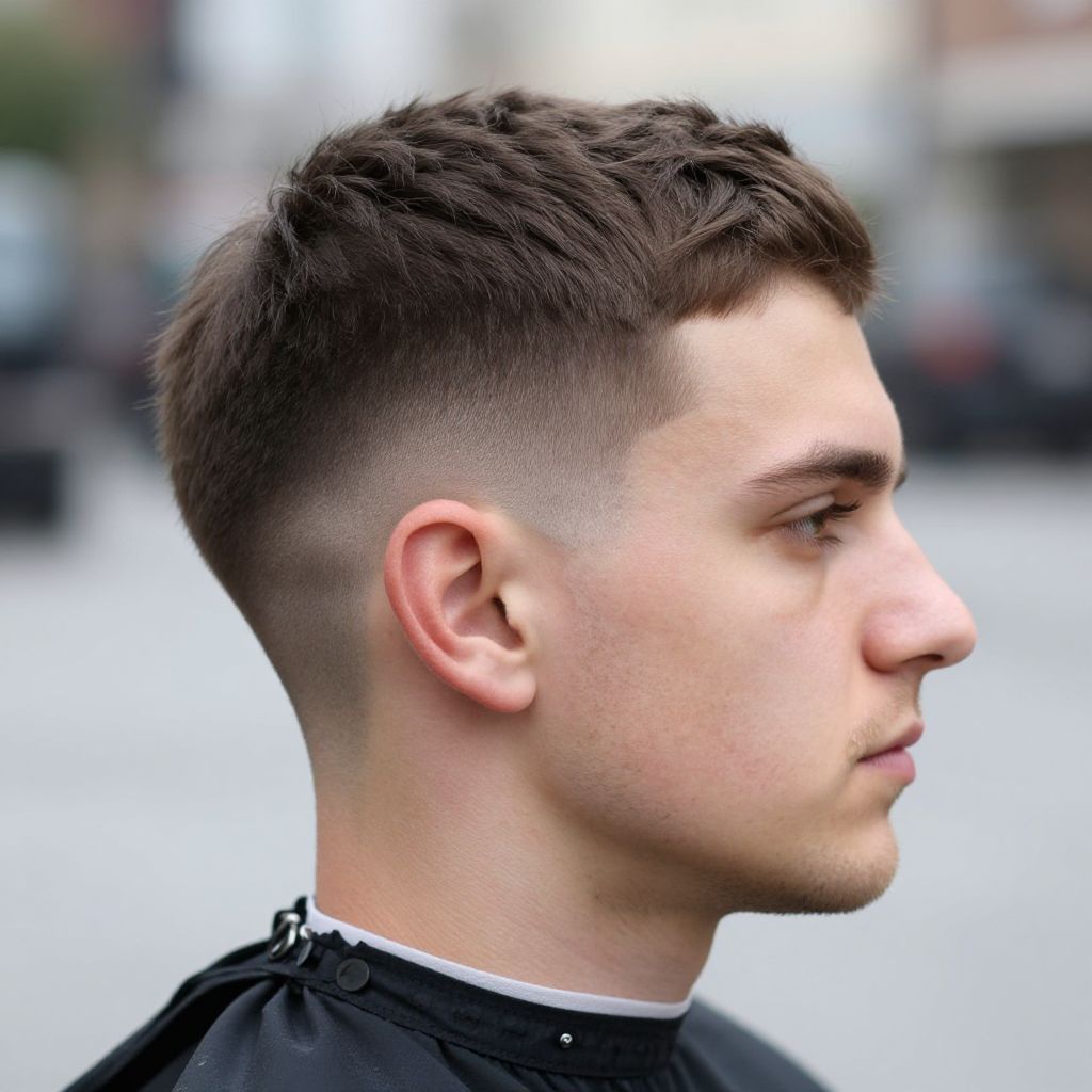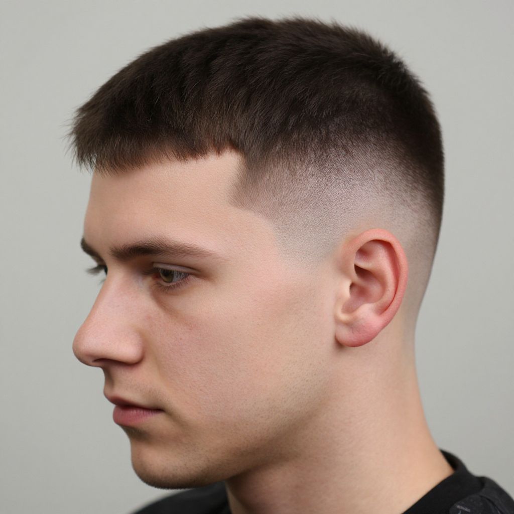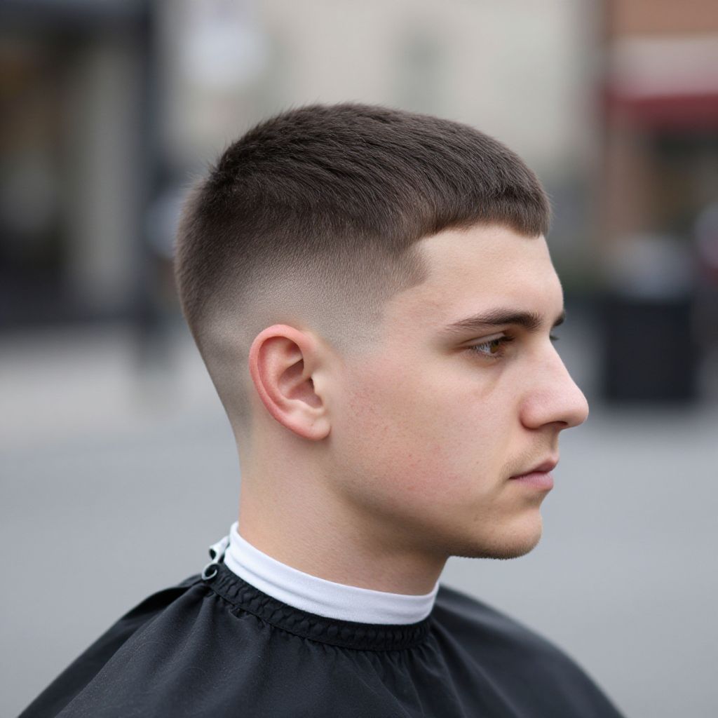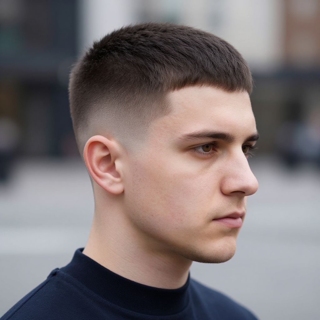 Flat Top Crew Cut, fit European man, realistic photography, natural light, urban street style, clean lines, modern look, textured hair, professional portrait, high detail
