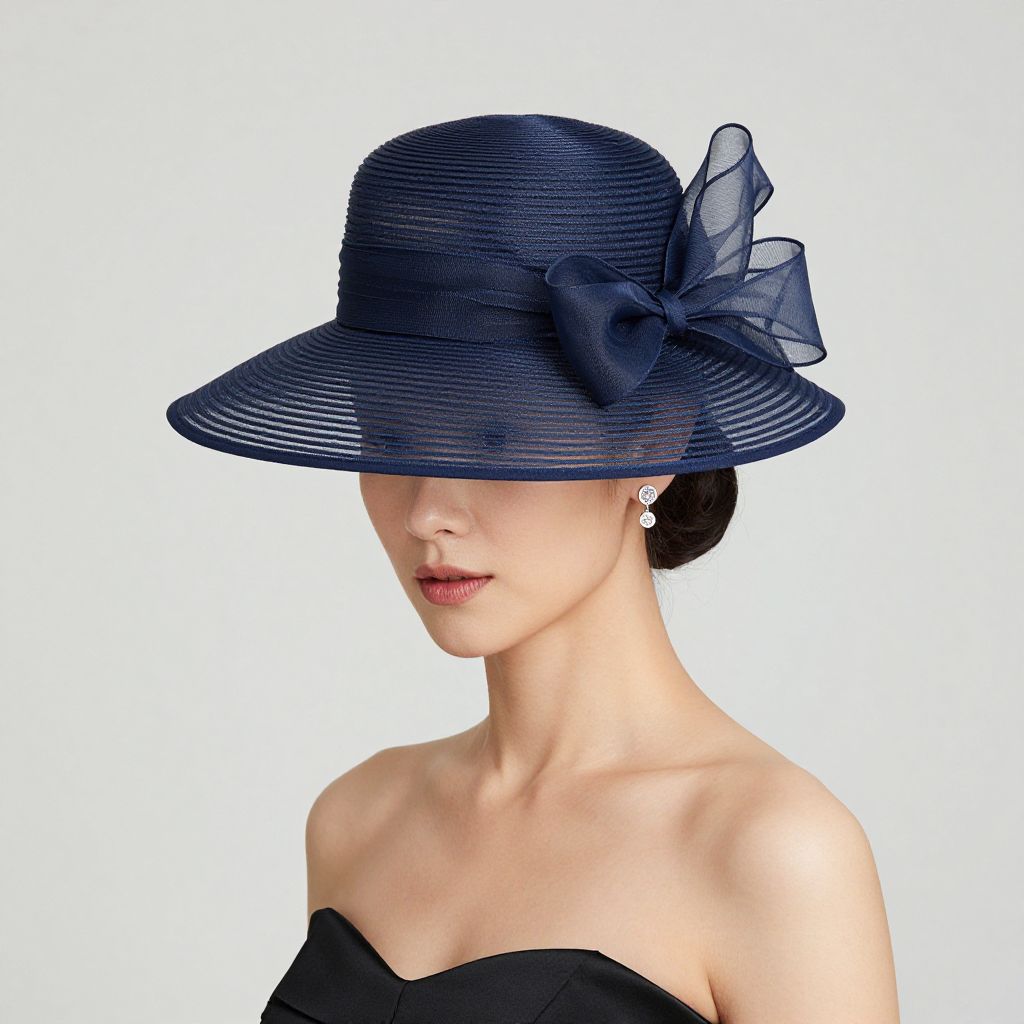 Photograph of a fair-skinned woman with dark hair in an elegant updo, wearing a navy blue, wide-brimmed hat adorned with a translucent, sheer bow on the right side. She has red lipstick and small, pearl stud earrings, and is dressed in a strapless, black dress. The background is plain white, emphasizing the hat and her refined, sophisticated appearance. Her face is partially obscured by the hat's brim. The texture of the hat is slightly ribbed, adding a subtle, delicate pattern to the design.