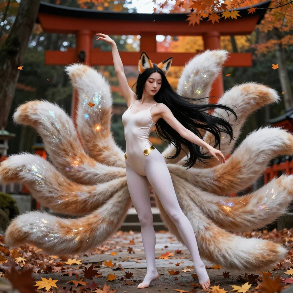 Kitsune human form female in graceful pose, long black hair, fox ears and multiple tails shimmering, surrounded by swirling autumn leaves and ancient shrine backdrop