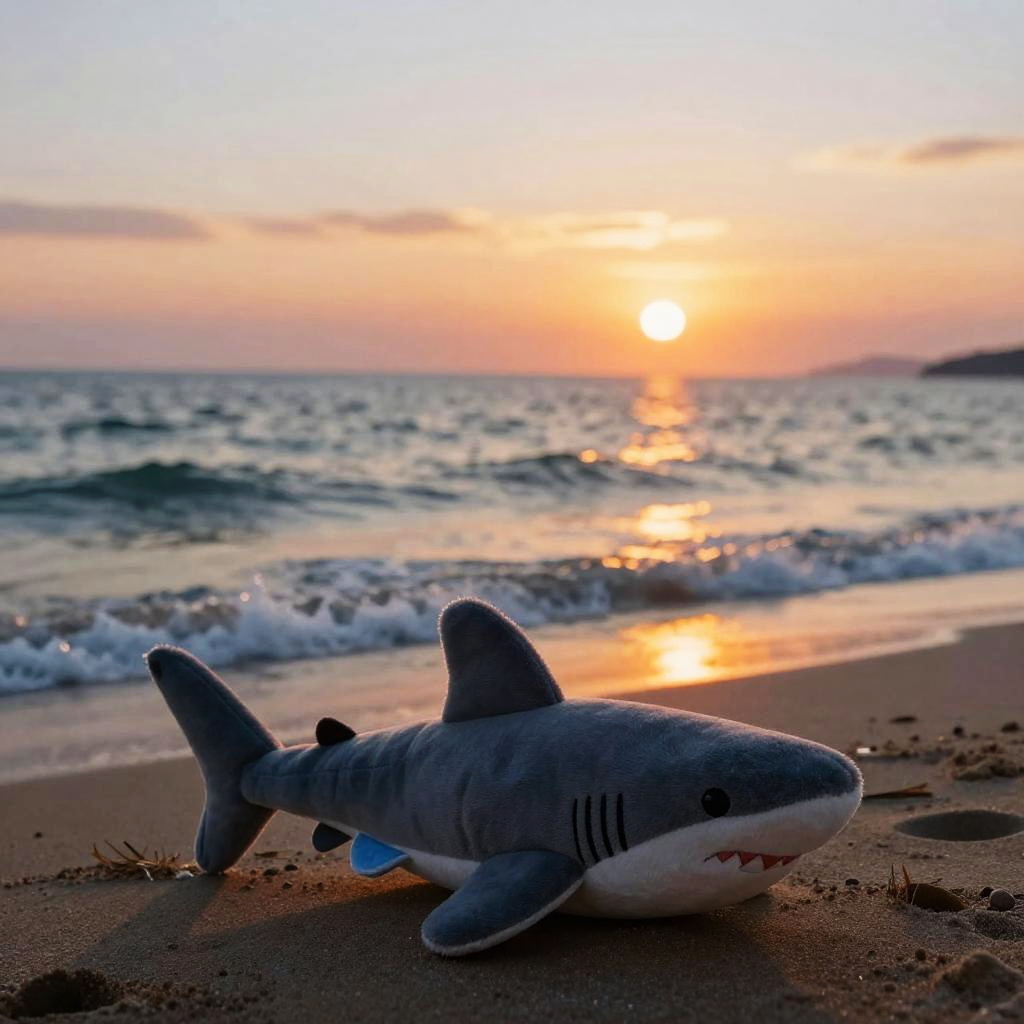 Blahaj colors inspired by sunset over the sea, warm oranges and cool blues intertwining, realistic style, gentle waves and silhouetted shark plush on a sandy beach
