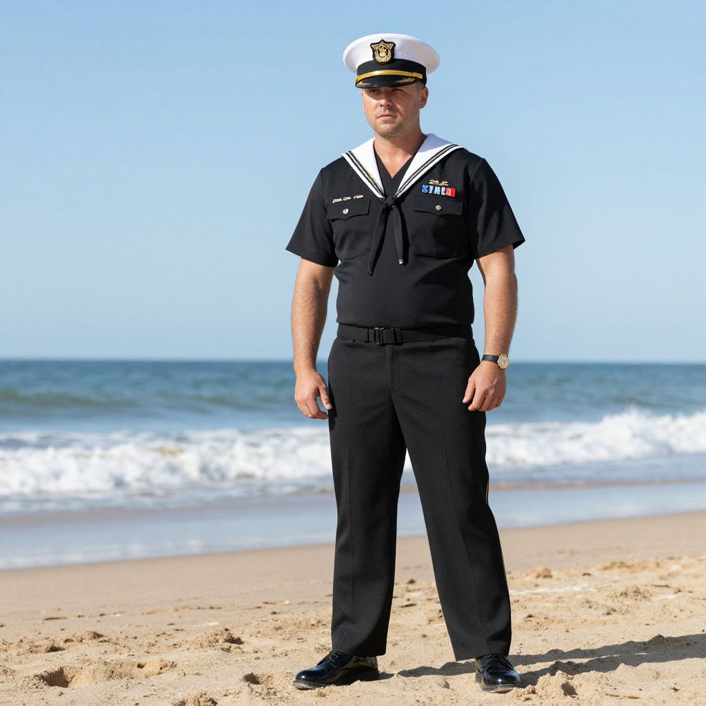 Navy Captain Costume, naval man in uniform standing on the beach