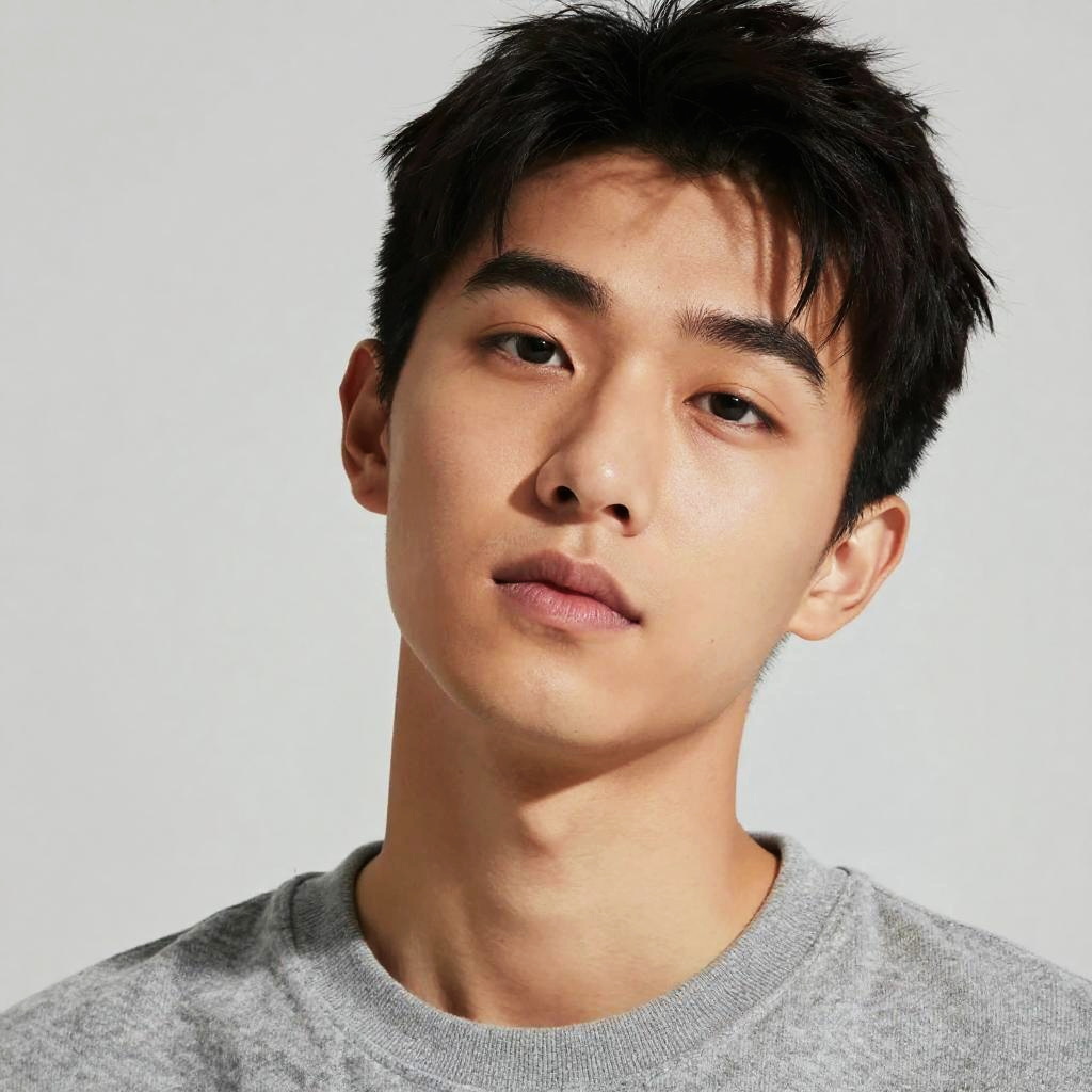 Portrait of positive canthal tilt Asian individual, confident gaze, smooth complexion, sunlight highlighting face contours, casual attire, minimalist background, detailed texture