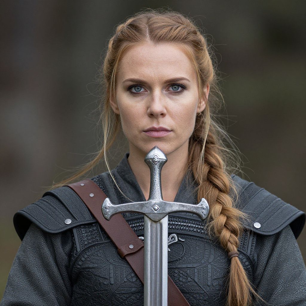 "Woman Viking, a close up of a woman in a viking costume with a sword"