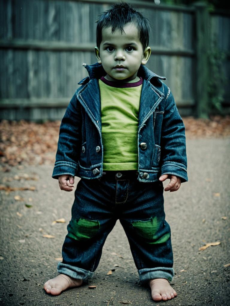 Infant frankenstein costume, male focus, 1boy, solo, barefoot, colored skin, full body, standing, pants, jacket