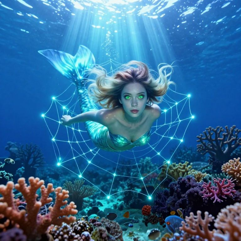 A surreal portrait depicting an ethereal mermaid entangled in a web of glowing coral and aquatic flora, viewed from beneath the ocean surface. With her mesmerizing green eyes wide open, she gazes directly at the viewer while gracefully swimming through an underwater garden illuminated by ethereal light beams piercing the deep blue sea. The scene evokes feelings of wonder, tranquility, and a touch of mystery as vibrant colors blend seamlessly with the surrounding marine life, creating an otherworldly atmosphere that defies conventional perception.