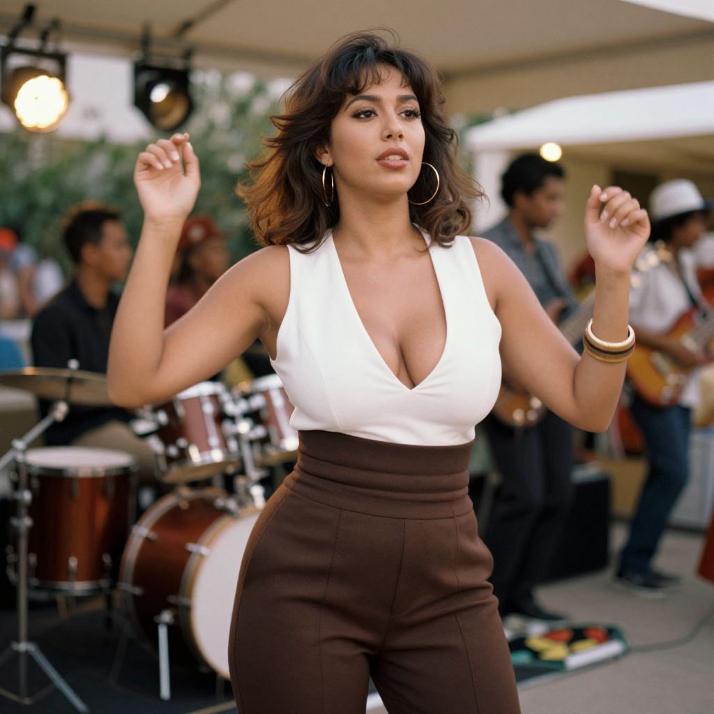 A hourglass woman in a contemporary chic outfit featuring a white sleeveless top with a plunging neckline and high-waisted chocolate brown trousers, accessorized with gold hoop earrings and a bangle bracelet, stands in a vibrant outdoor live music setting, swaying to the rhythm of the band. The scene is captured in the warm tones of ektachrome film stock. Sexy. Pretty face and beаutiful eyes. Big breasts