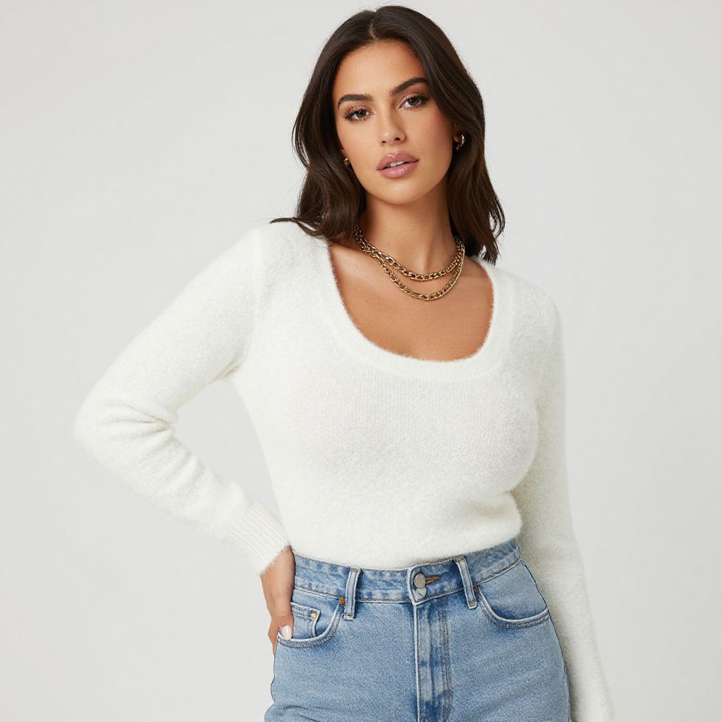 Photograph of a dark-haired woman with fair skin, wearing a white fluffy sweater, gold necklace, and high-waisted blue jeans, standing against