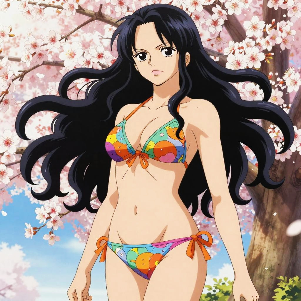 Digital anime-style artwork of a confident, curvy woman with long black hair, wearing a colorful floral bikini, standing under blooming cherry blossoms.