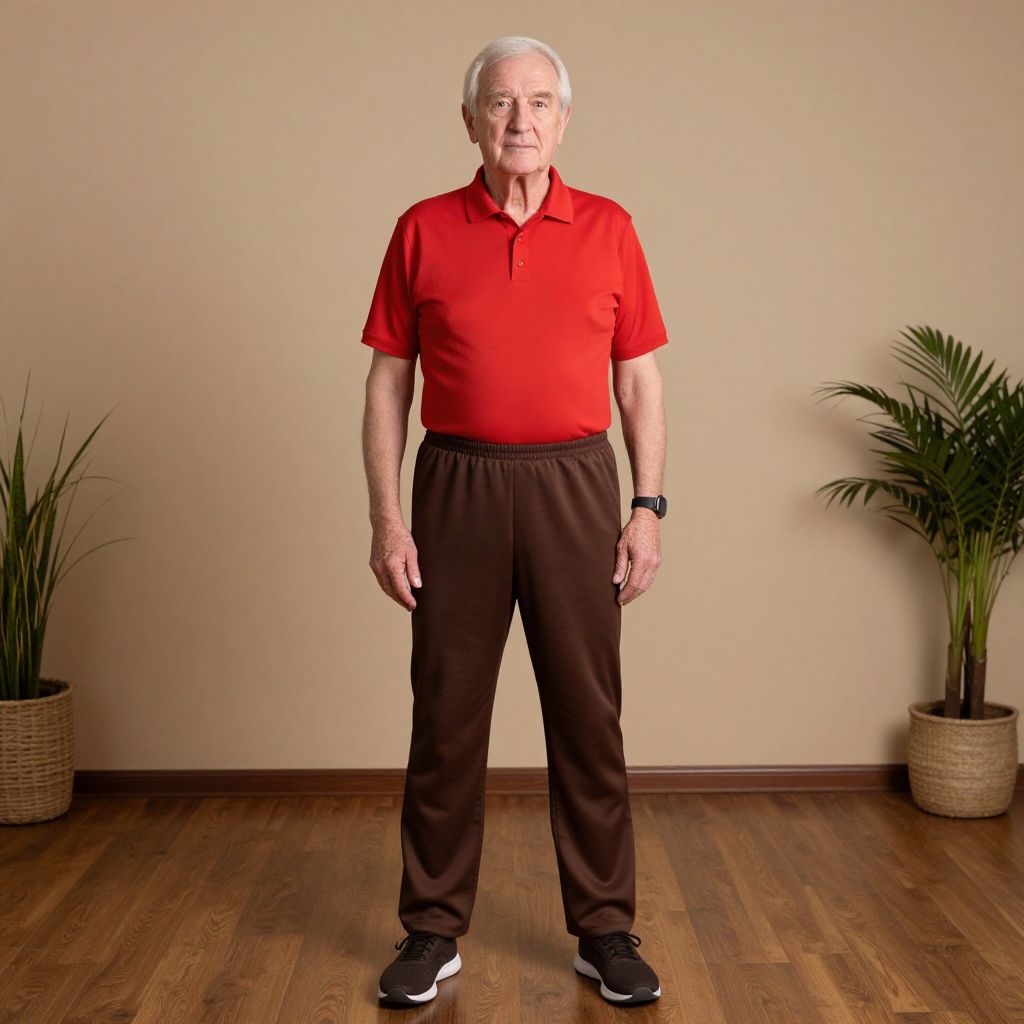 Male 80s Workout Costume, man in a red shirt and brown pants standing in a room