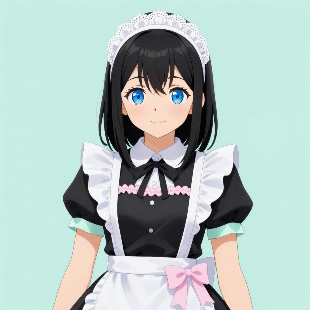 Digital illustration of a young anime-style female maid with silver hair and purple eyes, wearing a pink and white maid outfit with blue buttons and a matching hat. She stands in a warmly lit vintage kitchen with wooden cabinets, a large clock, and kitchenware visible in the background. The scene combines a classic environment with modern anime character design.