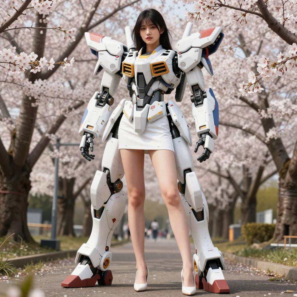 An extremely best quality, masterpiece, extremely detailed, realistic, A beautiful girl casually standing in front of cherry tree and mecha, center, whole body, mecha, long hair, white miniskirt, long legs, high heels, looking at the camera, photo, best quality, 8k, ultra high res, (photorealistic:1.4), highly detailed, intricate detail, delicate and beautiful, good lighting, professional lighting, sharp focus, detailed shadows, exquisite details and textures, depth of field, unity 8k wallpaper